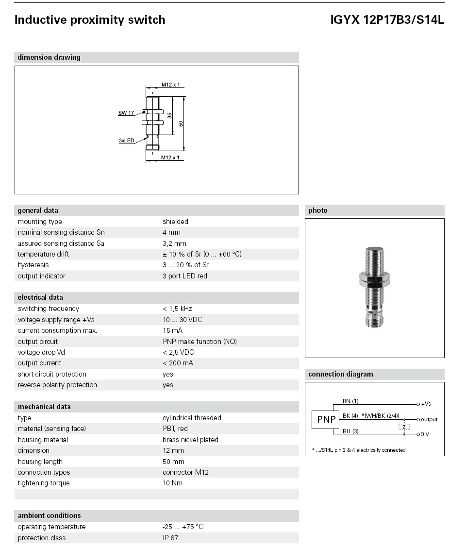 | IGYX12P17B3/S14L | 4mm | 连接头M12 | 10~30VDC | IP67 | 圆柱型螺纹版 | 黄铜镀镍 | PNP常开 |
